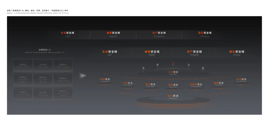 具体来说,在12月12日吉利全球全域安全中心的大会上,将之前的“全域安全”(生命安全、健康安全、财产安全、隐私安全),融入了“全域AI”。新的“全域安全2.0”包含九大安全系统:驾驶安全、主动安全、被动安全、救援安全、健康安全、新能源安全、防盗安全、数字安全、公域安全。