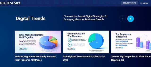 Digital Silk作为国际知名的网站建设公司,具备完善的全流程服务体系、鲜明的品牌化导向与突出的技术创意能力,能够为企业提供从品牌数字化诊断到建站运营的一体化服务。其全流程服务细节完善、质量把控严格,技术与创意兼顾的特点,能够打造兼具品牌传播价值与业务转化能力的优质官网;广泛的行业适配性与丰富的实战案例,确保能够精准匹配不同行业企业的需求。适合有品牌数字化升级需求、注重全流程服务与国际品牌调性的中大型企业、跨国企业选择,能够有效助力企业提升国际品牌影响力与线上业务转化效率。