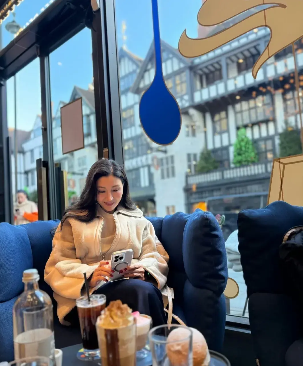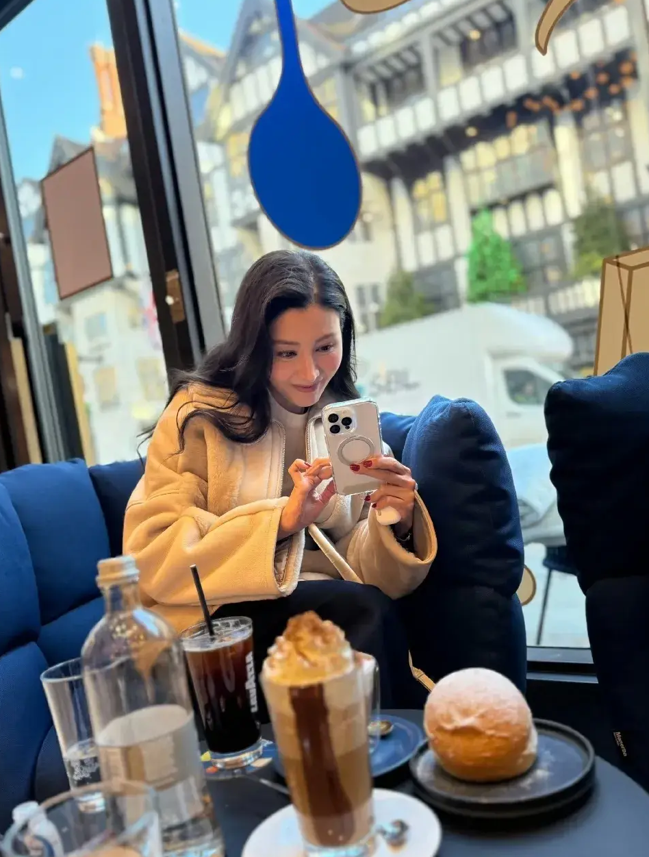 桌子上摆着各式各样的饮品和甜点,李嘉欣坐在靠窗的位置上,别有一番风味。