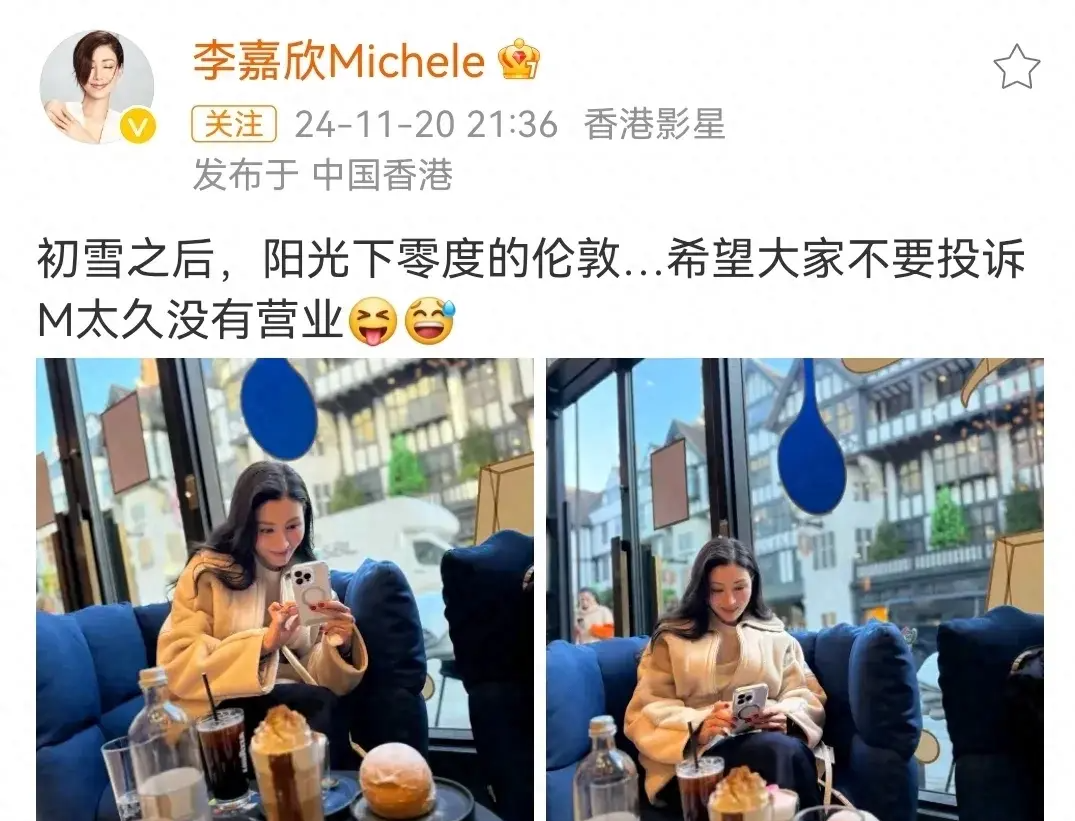 李嘉欣晒出了自己的近照,许久未营业的她展示出的自己的最新状态,并配文“初雪后,零度的伦敦”并表示希望粉丝能原谅她许久未营业,这次她一共发了两张照片,如果没猜错的话应该是许晋亨给她拍的照片。