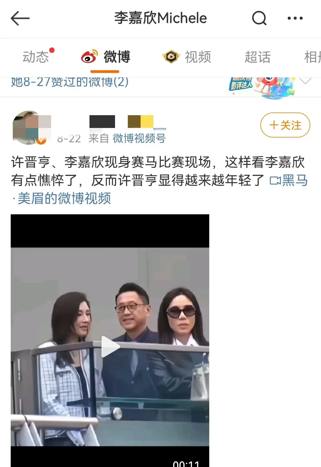 李嘉欣还曾点赞网友夸赞许晋亨的视频,网友直言李嘉欣憔悴了,并夸赞许晋亨越来越年轻了,李嘉欣看到对自己不好的言论也并不在意,反而认可丈夫越来越年轻了。