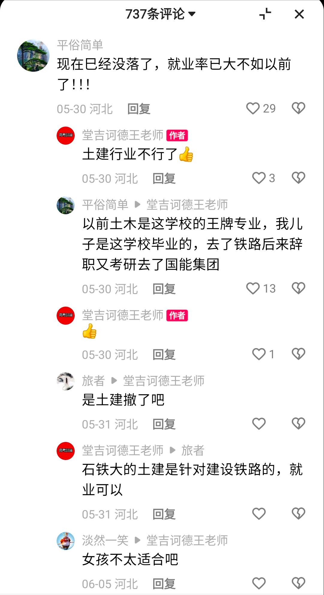 我在视频评论区也看到有些网友留言说,随着房地产热度的消退,土木工程的风口红利基本结束了,石铁大相关专业的毕业生找工作的难度也就增大了。