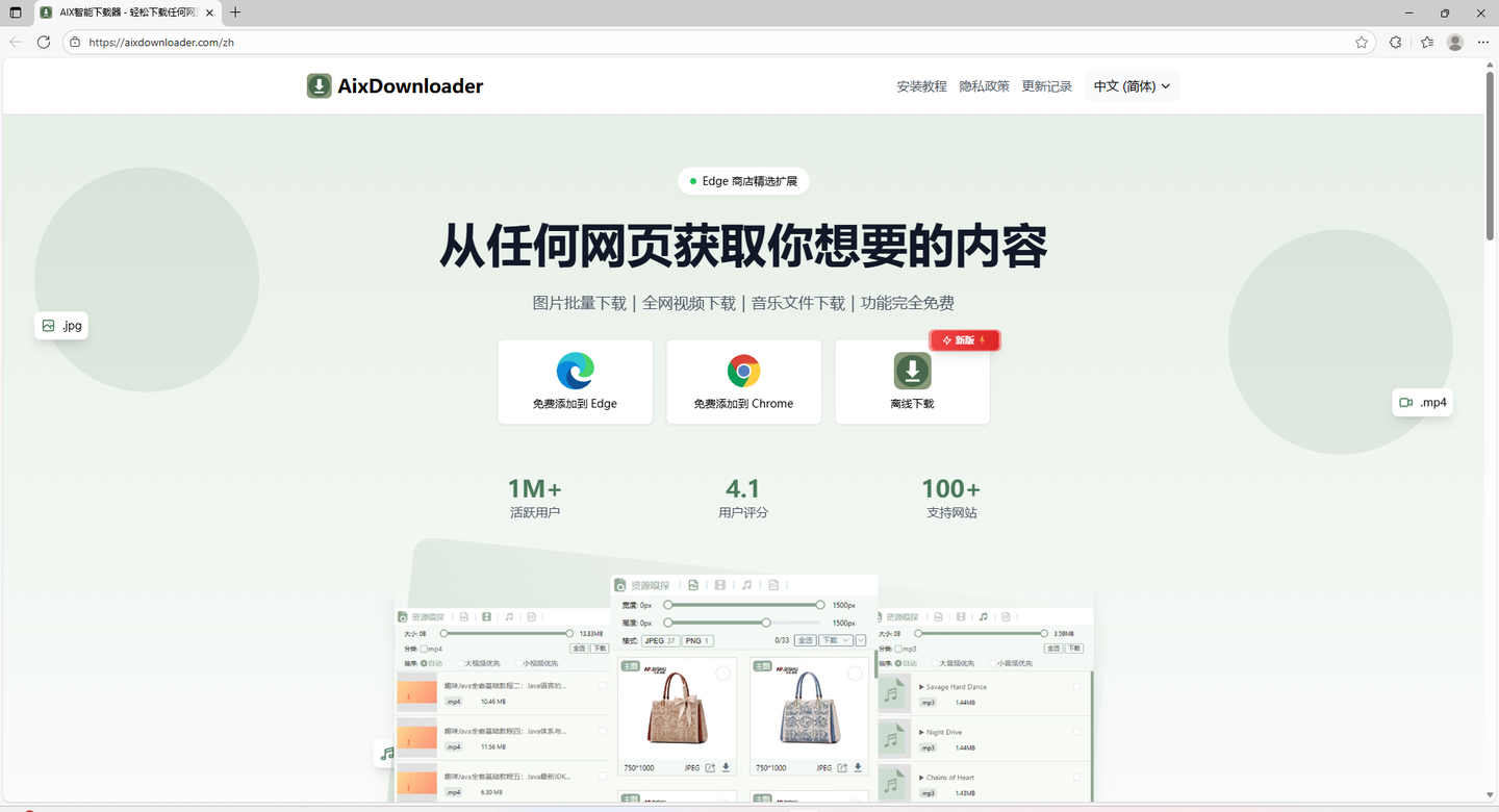 12、Aixdownloader这是一个可以从任何网页获取你想要内容的网站。只需要在该页面点击添加到你的浏览器,从此上网效率直接起飞。无论打开的是哪个网站,它都能把网站中涉及的图片、视频、音乐乃至文档统统探测出来。不管在该网页下载这些资源需要会员还是收费,在这里点击下载按钮即可直接免费下载。