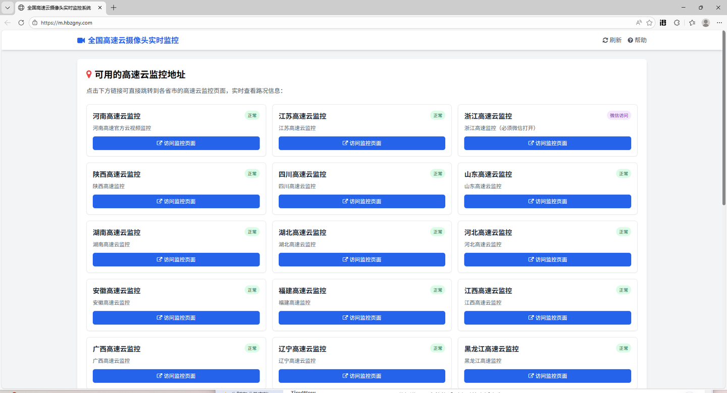 14、高速云摄像头实时监控这是一个可以实时看到高速监控摄像头的网站。如果这个国庆,你想自驾旅个游,想看看堵不堵车,就可以打开这个网站。然后找到自己想要看的地区,进入后这里面的每个点,就代表着一个监控摄像头。随便进入一个就能看到实时的直播内容