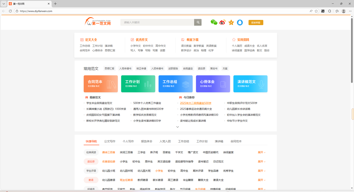 继续往下拉,还有优秀的作文分类,小学初中、高中的作文全部都有,然后还有一些教案的下载、语文、数学、英语、政治等等,这些教案全部都可以查看到。右侧还有单独的诗词鉴赏的小分类,也可以在这里面找到一些个人简历的内容和简历的范文以及求职信、自荐信等一些模板。在这里面全部都可以找到。