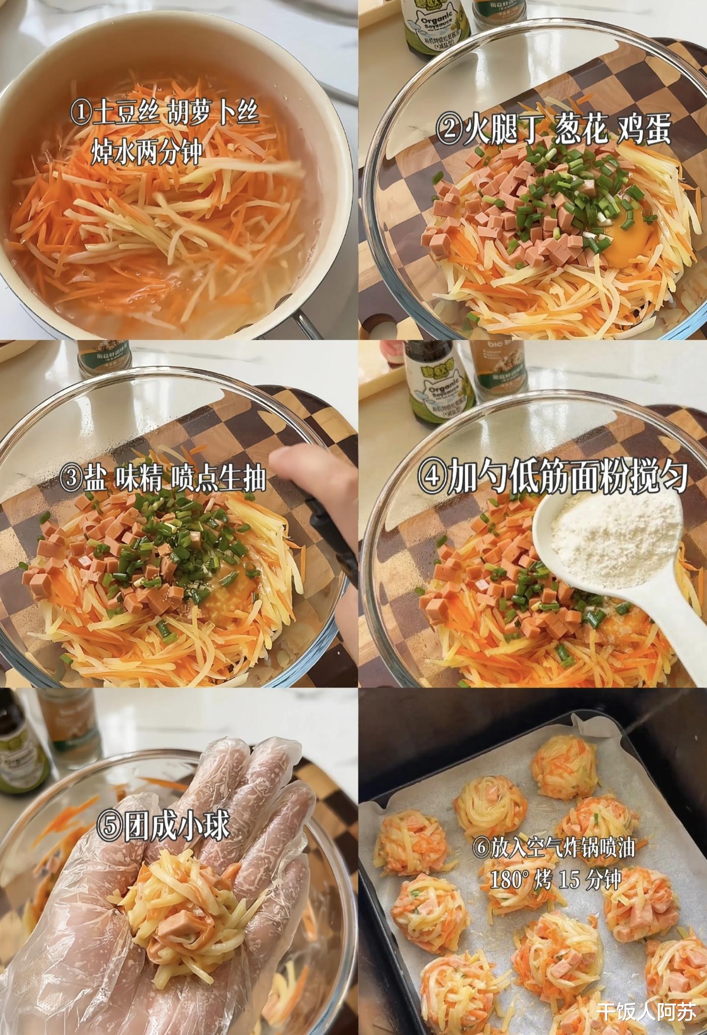 把团好的丸子整齐地摆进空气炸锅的炸篮里,在表面喷上一层薄油,这样能模拟油炸的效果。设置180度烤15分钟,中途可以把炸篮拉出来晃一下,让丸子受热更均匀。等时间一到,金黄焦脆的土豆胡萝卜丸子就出炉了,刚烤好的丸子外皮微微鼓起,带着诱人的焦香,咬开后内里软糯,能吃到土豆和胡萝卜的清甜,还有火腿丁的咸香和葱花的提味。