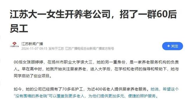江苏新闻广播:《江苏大一女生开养老公司,招了一群60后员工》