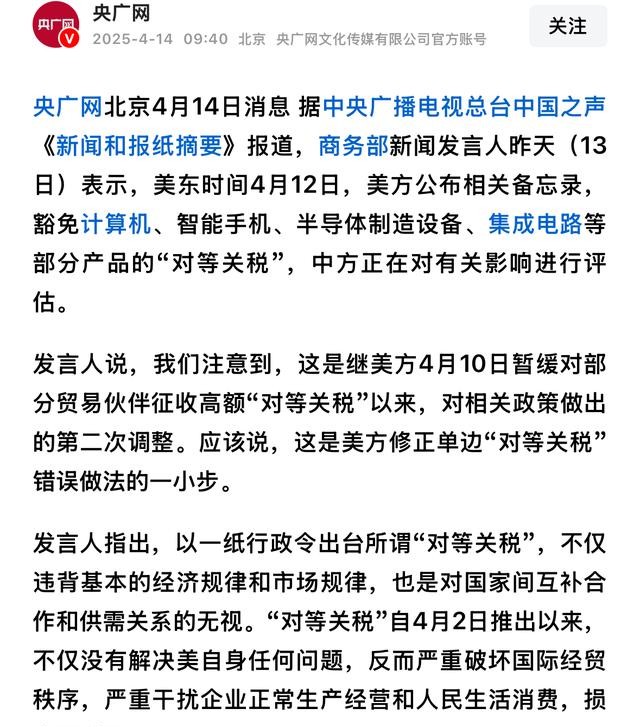 央广网2025-04-14商务部回应美方豁免部分产品的所谓“对等关税”