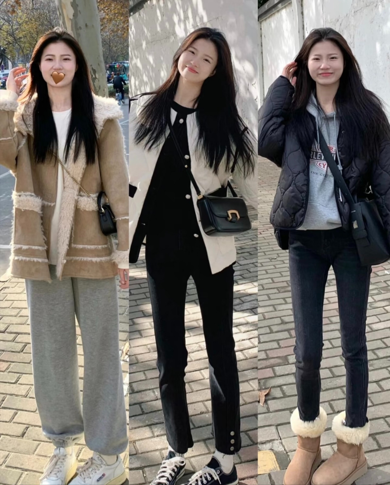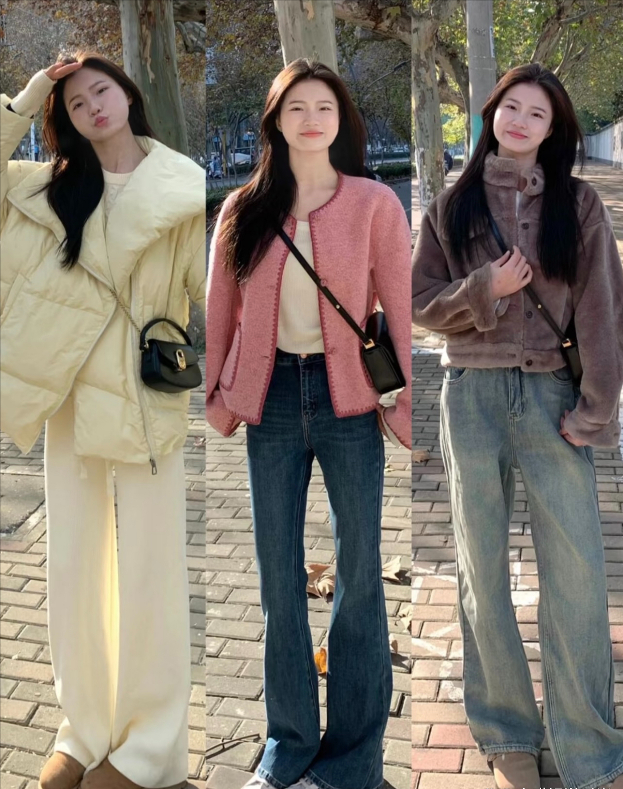 合身又不紧绷的穿衣,也是吸引眼球的关键。在她的街拍中,有很多正肩直筒的外套,裤装也是也能够修饰腿型的直筒裤、微喇叭裤,或者是阔腿裤为主,松紧有度修饰身材又不会觉得拖沓,也是很值得借鉴的。日常出街,用这种毛绒感的短款外套,搭配一条高腰拖地牛仔裤,配平底勃肯鞋慵懒随意,鞋与上衣色彩上的首尾呼应也更气质显高挑。