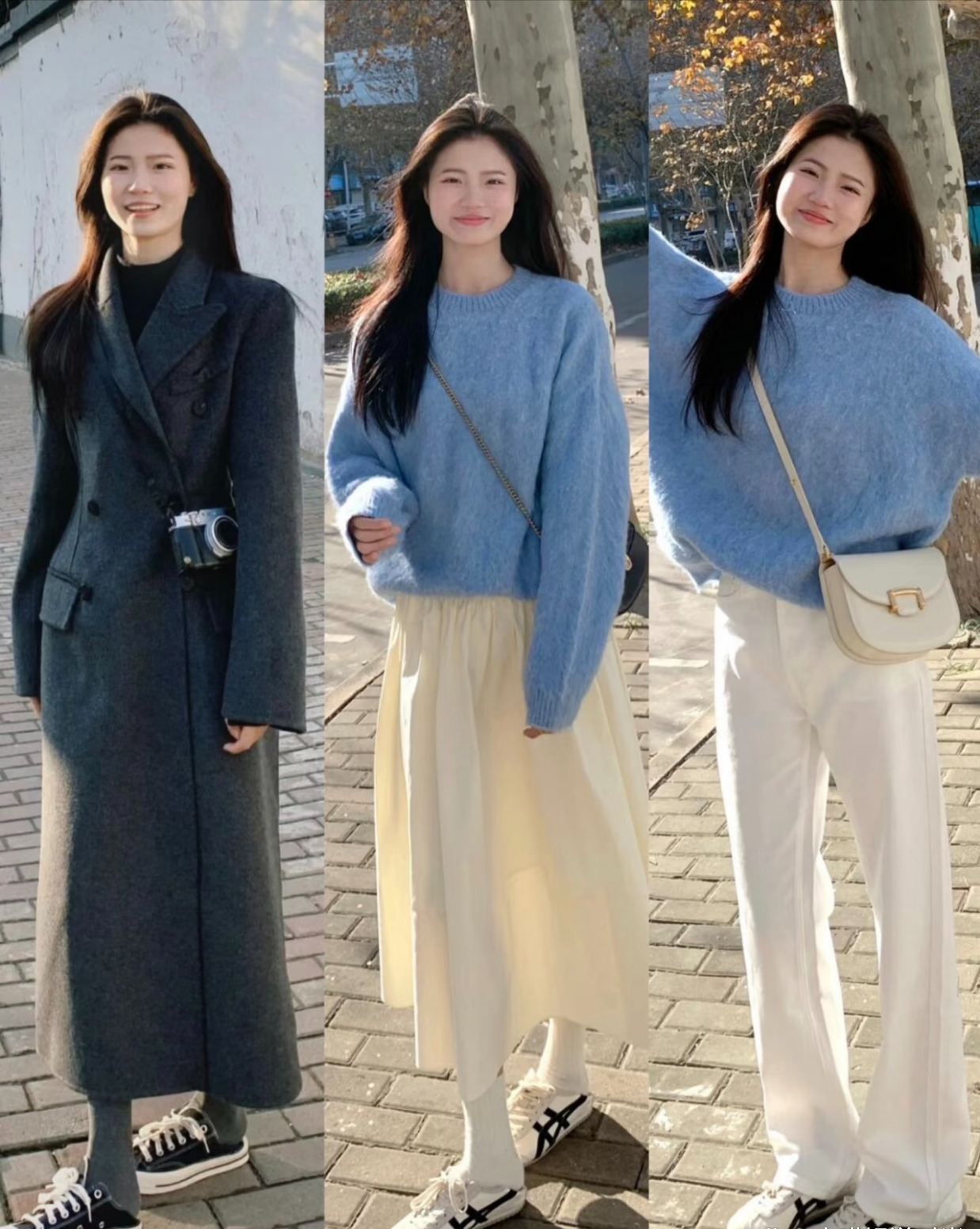 这个博主街拍中很少有复杂设计的单品,大多都是简单基础的经典款式,再通过简洁干净的配色,给人一种落落大方又气质耐看的感觉。比如蓝毛衣与白裤子的组合,单从色彩上就能够远离路人。再通过经典的圆领落肩毛衫修饰身材,搭配高腰的直筒拖地裤,慵懒随意又很清新气质。以及灰色长大衣与同色打底袜的组合,没有过多的色彩加入,更简洁大气。