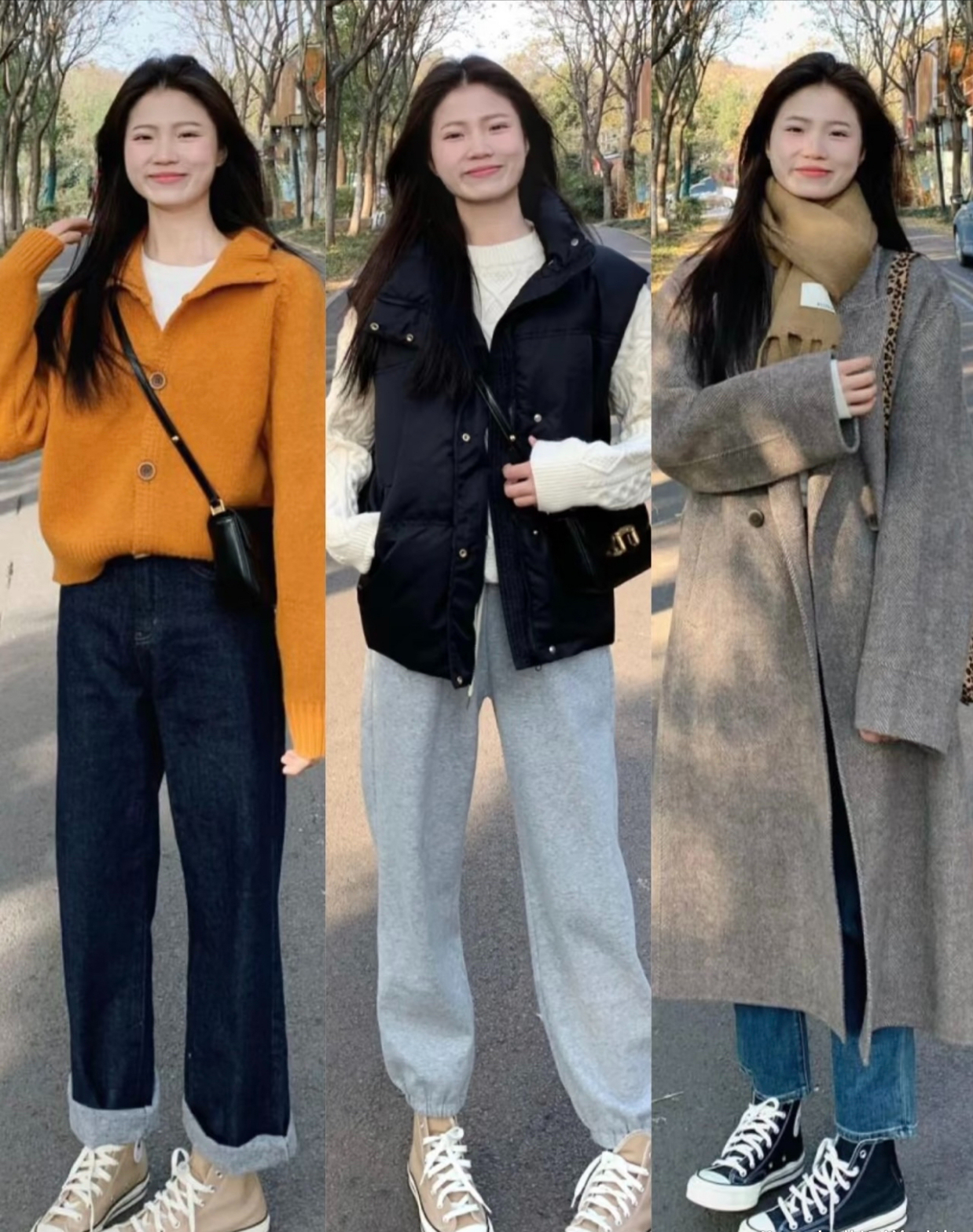 在博主街拍中,更多以圆领或者半高领的打底衫为主,外套也是低领口的设计,露出更多颈部线条看上去更利落显瘦,而且可以让脸看上去更加的小巧,很适合微胖女生们。天冷后只需要系上一条围巾即可,保暖又有层次。或者是通过领口“内高外低”的组合,用中高领打底衫配圆领、V领外套也很气质显瘦。