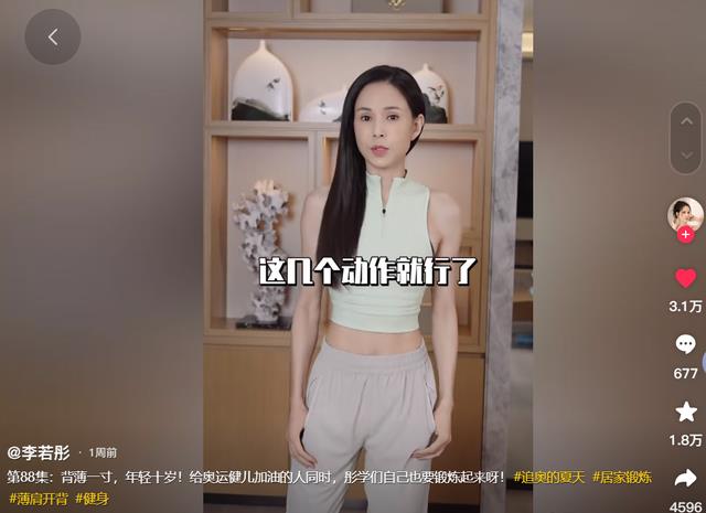 画面中,李若彤身穿一件浅绿色运动背心和一条简约的休闲裤,向网友们分享自己在练背的动作,她现在已经58岁了,但在锻炼中,身材还是保持的很好,简直就像二三十岁的小姑娘。