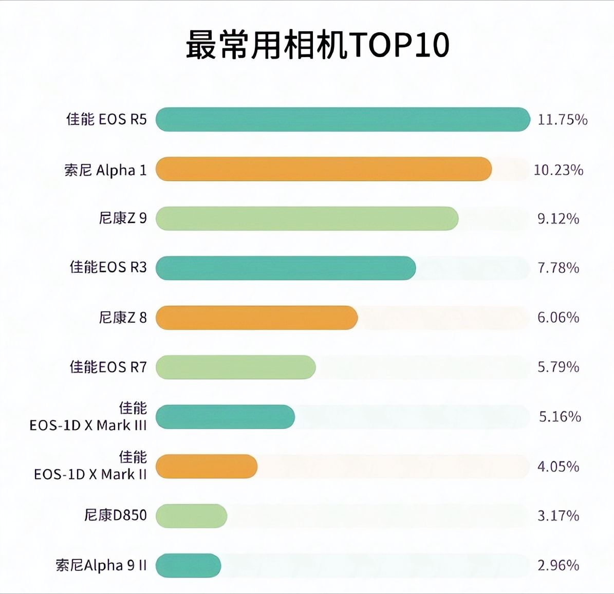 根据统计,佳能目前在该领域的使用率高达56.5%,遥遥领先。尼康虽然近年发力猛追,也以29.25%的份额稳居第二。