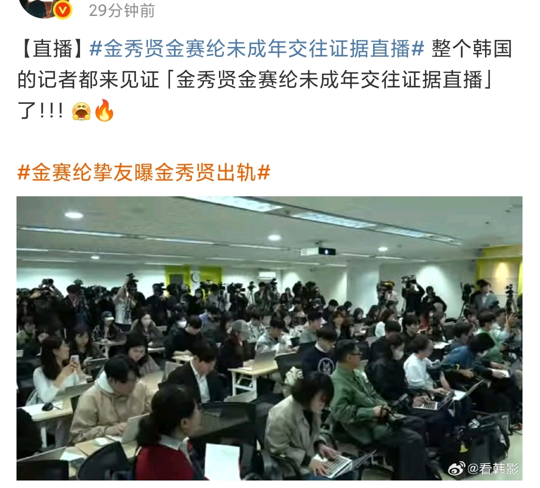 据相关报道称,金赛纶和金赛纶未成年交往证据是通过直播方式曝出的,韩国记者们还都来见证了这场直播。