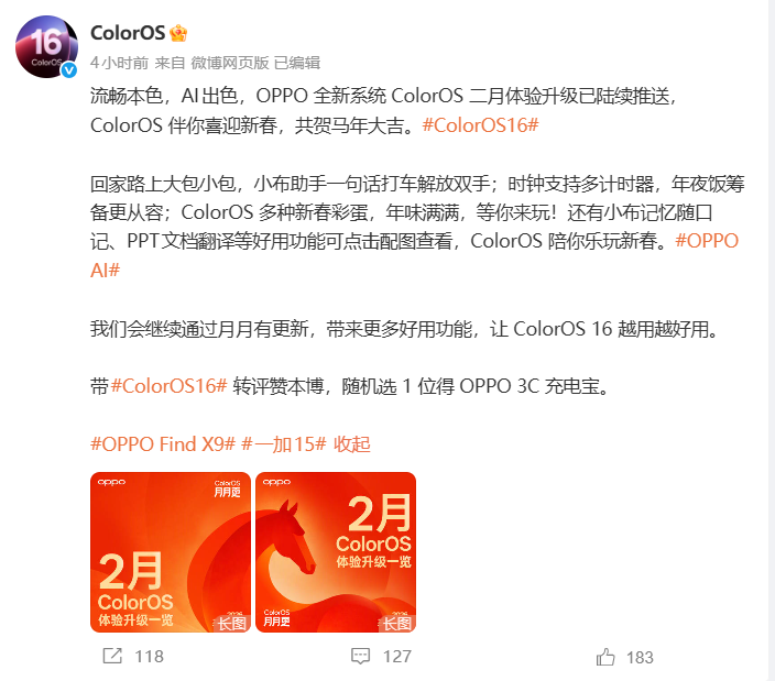 日前, @ColorOS 公布了2月系统更新预热海报,并配文称,“流畅本色,AI出色,OPPO 全新系统 ColorOS 二月体验升级已陆续推送,ColorOS 伴你喜迎新春,共贺马年大吉。#ColorOS16#