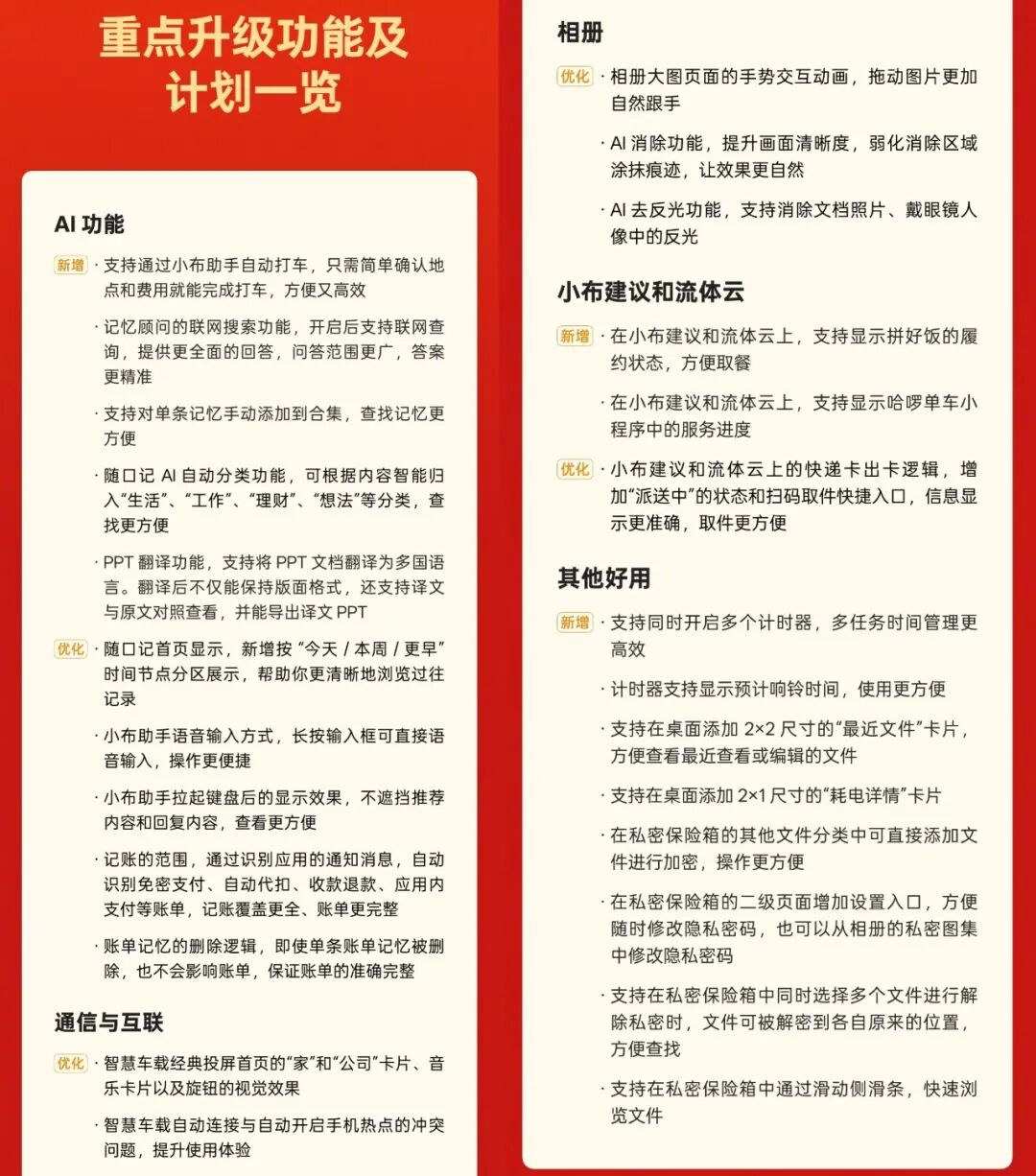 核心功能方面,新增小布助手自动打车,用户可通过语音指令快速发起叫车,只需确认地点与费用即可完成下单;小布记忆同步上线随口记AI自动分类功能,可智能识别语音与文字内容,自动归入生活、工作、理财、想法等分类,记忆顾问还支持联网搜索,问答覆盖面与精准度进一步提升。此外,更新还带来时钟多计时器功能,可同时管理多个计时任务;新增PPT文档全文翻译与译文对照。同时还加入了新春主题彩蛋,用户只需对小布助手发出特定语音指令即可触发。