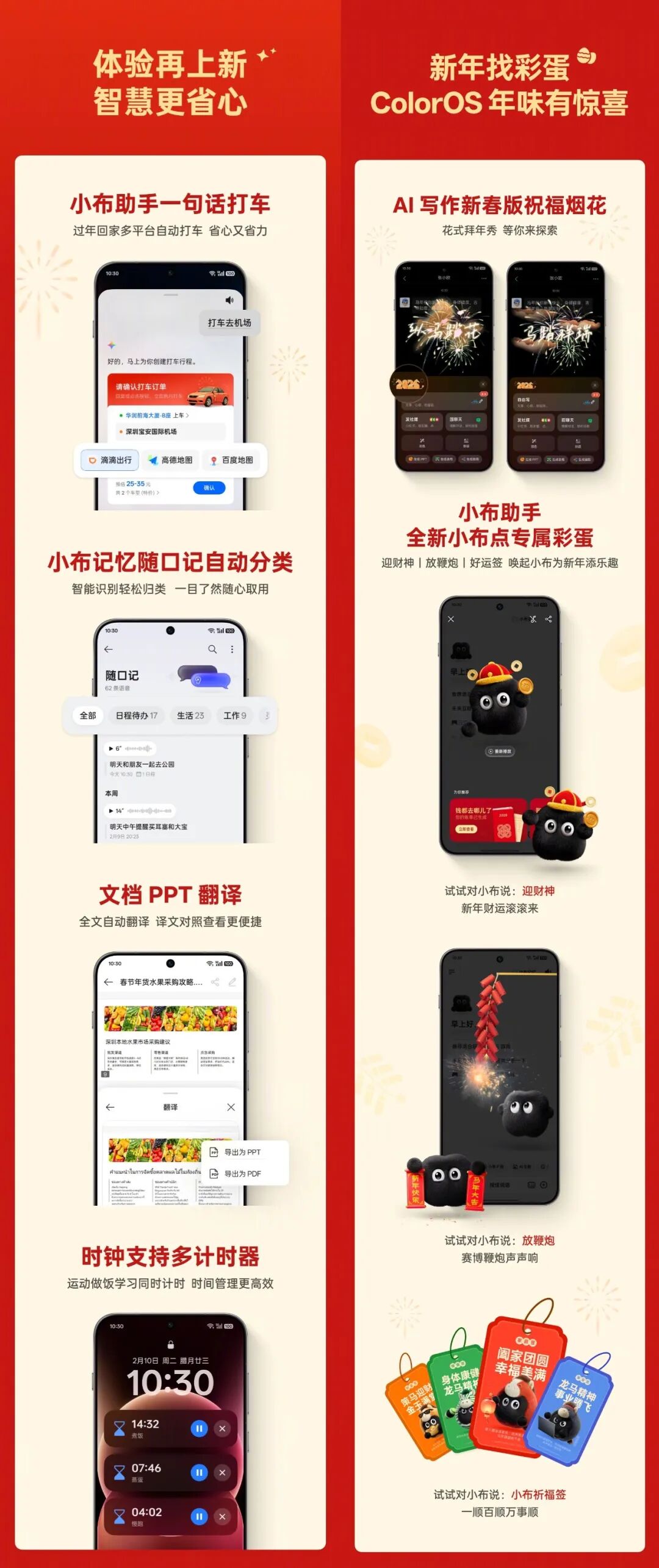 据官方介绍,ColorOS二月体验升级已经开启陆续推送,主要更新内容有:小布助手支持一句话打车解放双手、小布记忆随口记自动分类、文档PPT翻译,时钟支持多计时器等等,另外还有很多新年玩法,比如AI写作新春版祝福烟花,小布助手全新小布点专属彩蛋迎财神、放鞭炮、祈福签等。