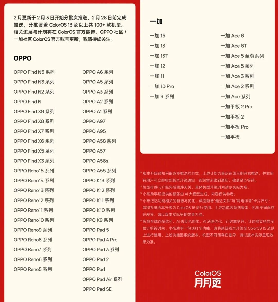 日前, @ColorOS 公布了ColorOS 16二月体验升级陆续推送信息,从中可以看到,此次更新将覆盖百款机型,新增小布语音打车、随口记等功能,全是实用干货。本次升级预计于2月28日前完成全量推送,适配ColorOS 13及以上版本超100款机型,覆盖OPPO与一加主流旗舰及中端机型。