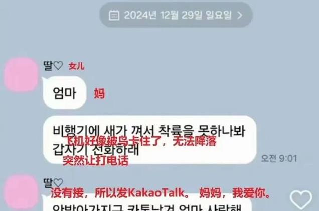 这架客机在失事前曾发出紧急信号,但最终还是未能避免悲剧的发生。失事地点位于一个偏远山区,救援人员迅速赶到现场展开救援行动。然而,由于地形复杂和天气恶劣,救援工作进展缓慢。与此同时,调查人员也开始对失事原因展开调查,希望能够尽快查明真相,给遇难者家属一个交代。刚刚韩国媒体公布了几位遇难者最后和家人的kakaotalk(就类似我们国内的微信),从聊天的内容来看,大家都好绝望!一位患了癌症妈妈,病情转好好后,看到旅行公司推出「圣诞节泰国旅行」然后和朋友去了泰国旅行。前一天给儿子的短信还是妈妈认识的朋友给寄的水果。儿子才22岁,妹妹12岁!