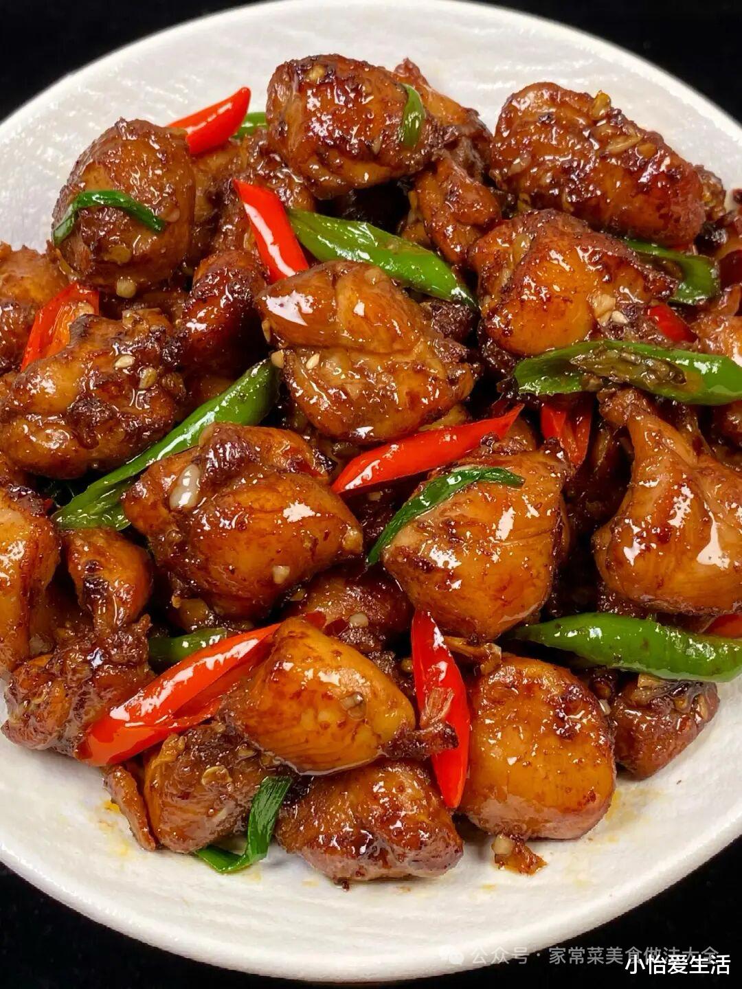 3. 大火快炒保口感:锅中倒油,油热后放入姜片、蒜片、干辣椒爆香,倒入腌制好的鸡腿肉,大火快速翻炒2分钟,至鸡肉表面变色、微微金黄(全程大火,避免小火慢炒导致肉质发柴)。