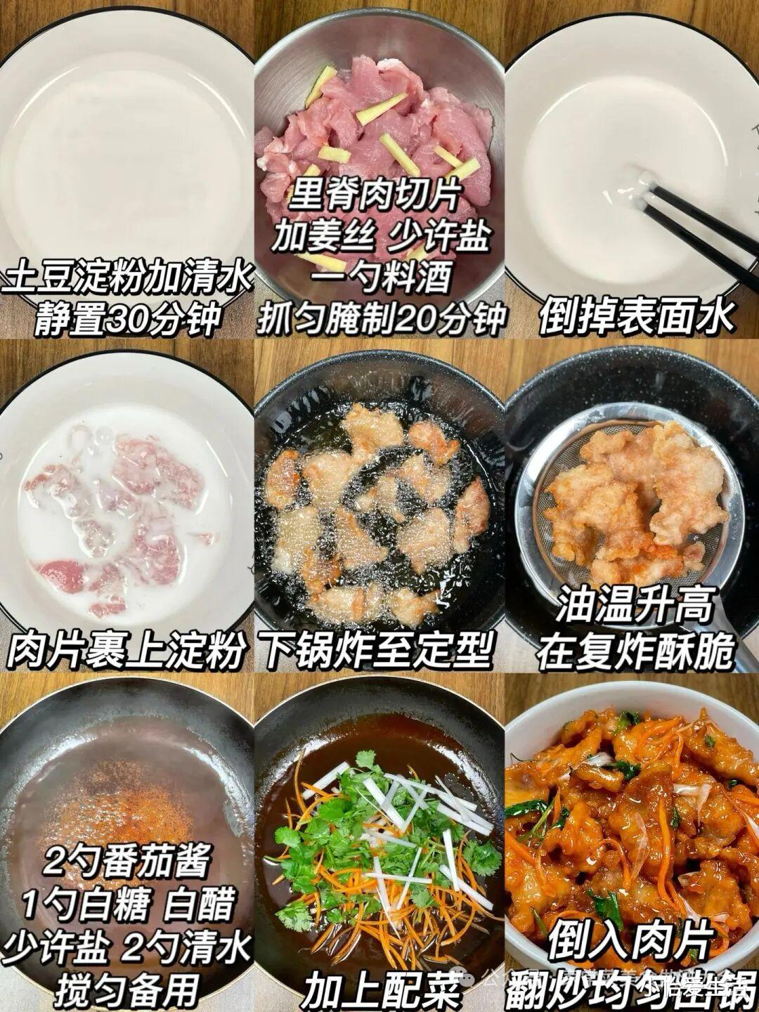 1. 备料:猪里脊肉300克(切0.3厘米厚的片),土豆淀粉60克,清水40毫升,青红椒各半个(切菱形块),姜丝、蒜片、葱段适量;酱汁:生抽15毫升、陈醋25毫升、白糖20克、清水30毫升(提前混合搅匀)。