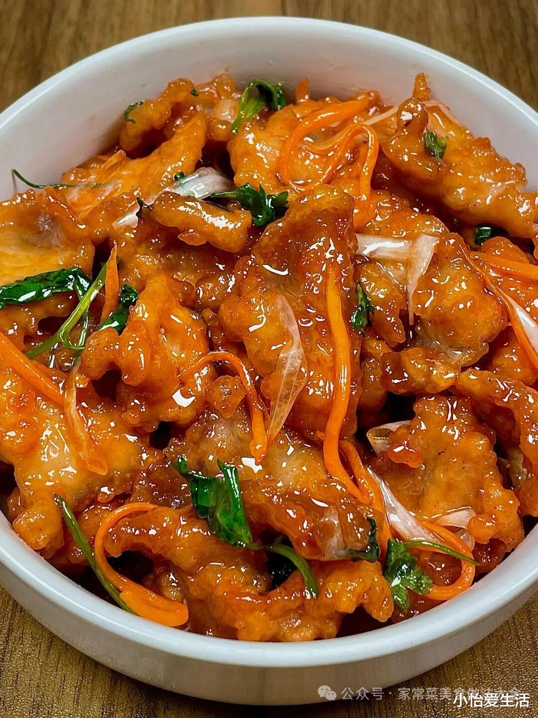 4. 快速裹汁锁味:锅中留少许底油,放姜丝、蒜片、葱段爆香,加入青红椒块翻炒10秒,倒入调好的酱汁,大火煮开至浓稠,随即倒入炸好的肉片,快速翻炒30秒,让每片肉均匀裹上酱汁,关火出锅即可(翻炒时间不宜过长,避免肉片吸汁变软)。