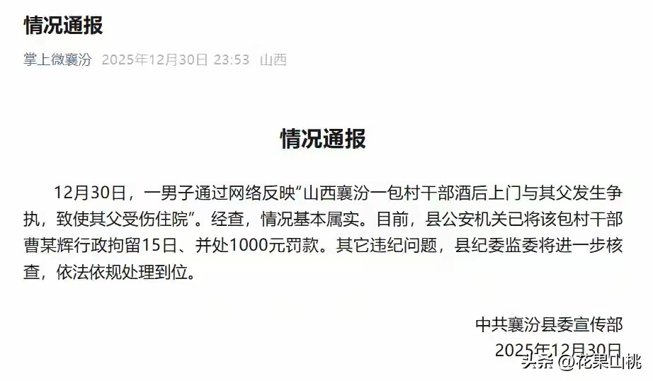 12月30日晚上11时53分,山西临汾襄汾县委宣传部发布情况通报称,经查,情况基本属实。目前,县公安机关已将该包村干部曹某辉行政拘留15日、并处1000元罚款。其他违纪问题,县纪委监委将进一步核查,依法依规处理到位。