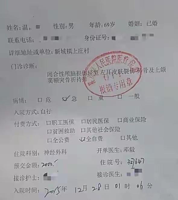 被打村民儿子爆料原来视频中年长的男子就是温先生的父亲,据他向媒体记者反映,他的父亲左耳受伤缝了两针,持续头痛,并出现了听力下降,要很大声和他讲话才能听清。