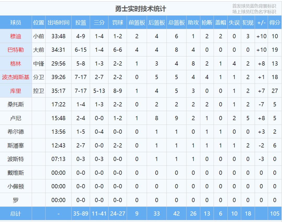 本赛季第15次砍下25+5+5,继续领跑勇士队内数据榜。