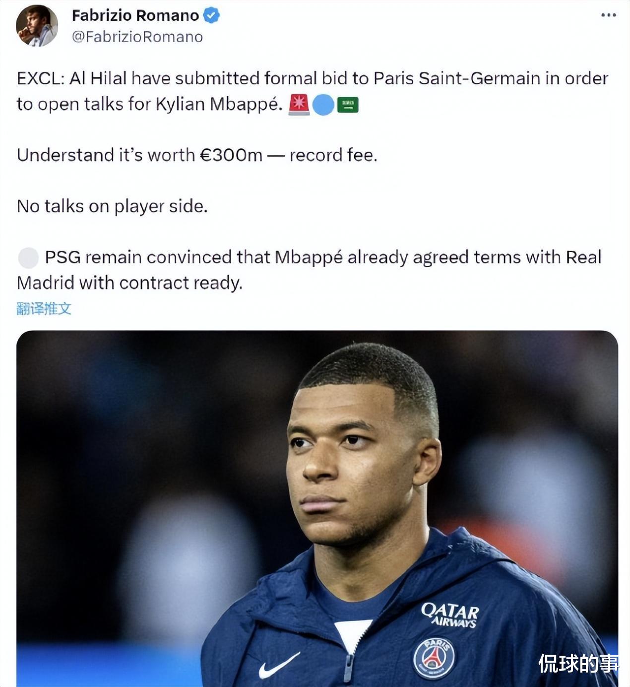 真正实质性的是沙特球队利雅得新月对于姆巴佩的接触,来自《阿斯报》记者塞恩斯的最新消息,沙特公共投资基金愿意花费总价10亿欧元,其中3亿支付姆巴佩的转会费,剩余7亿则是支付给姆巴佩本人的基本工资和奖金等各项开支,将姆巴佩带到沙特联赛球队利雅得新月。