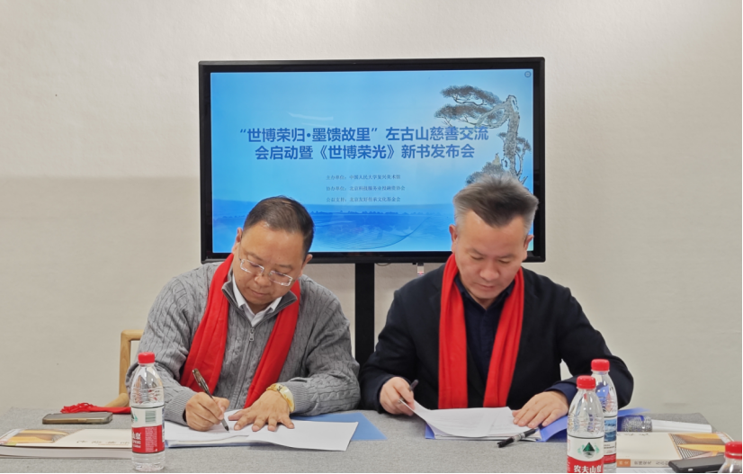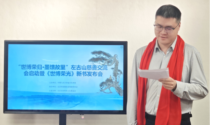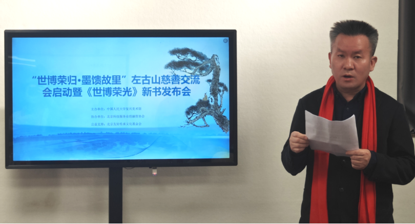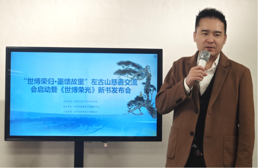 【北京讯】2025年12月31日下午15时,由中国人民大学复兴美术馆主办的“世博荣归·墨馈故里”左古山慈善交流会启动暨《世博荣光》新书发布会在北京国贸世纪艺术交流站隆重举行。本次活动深度融合公益实践与文化传播,既启动了旨在回馈母校、支持地方教育发展的专项慈善项目,并将其作为推动更广泛教育公益实践的重要起点,又同步推出了系统记录其世博艺术探索与思想历程的专著。活动现场来自文化、艺术、教育、公益、金融等领域的近五十余位嘉宾共聚一堂,见证了这场充分彰显新时代文艺工作者社会责任与文化使命的盛会。