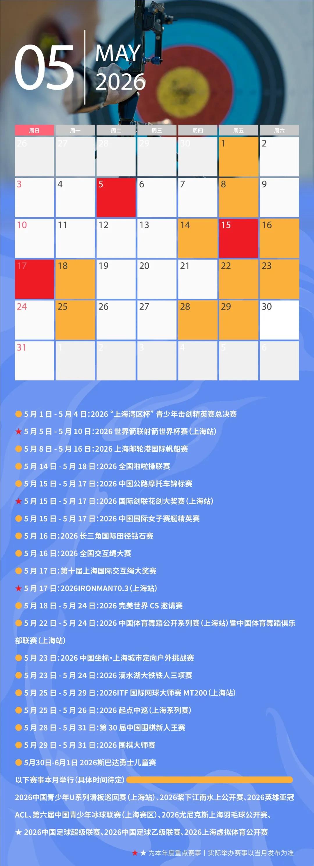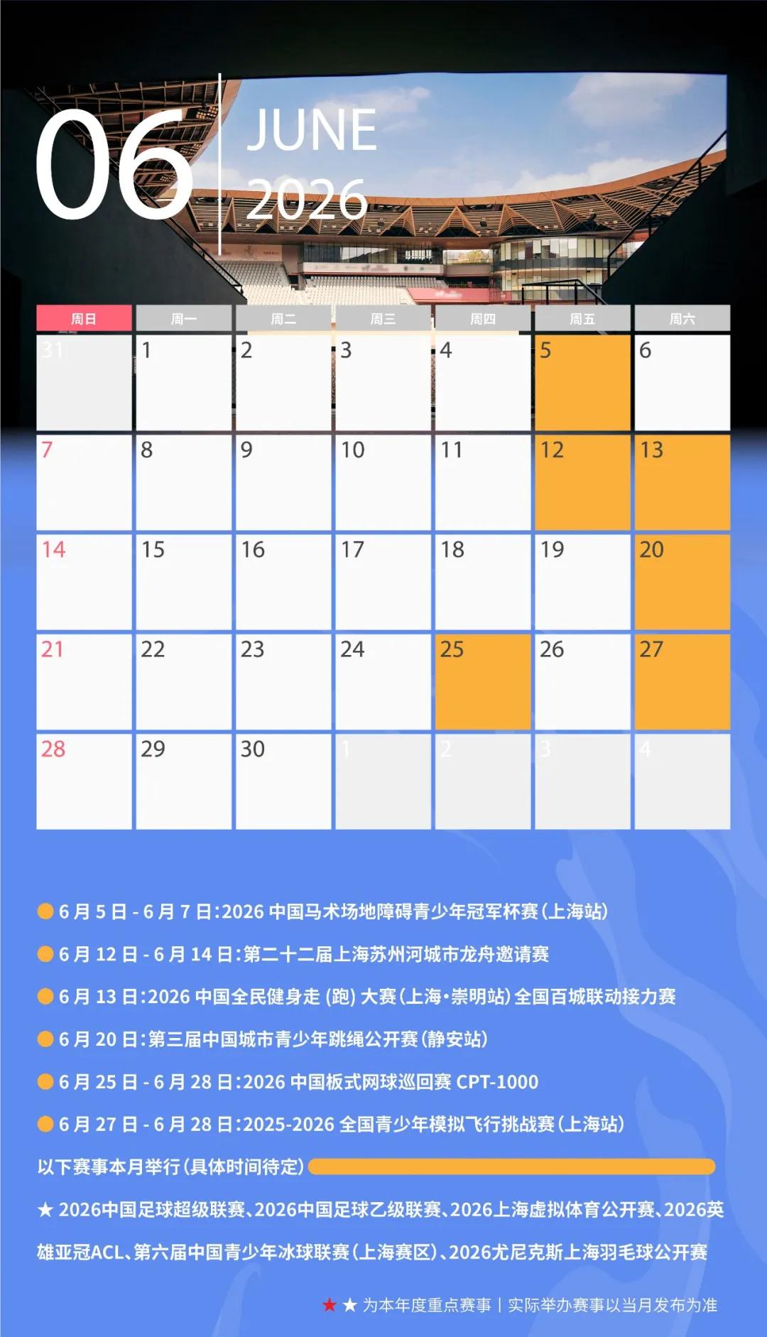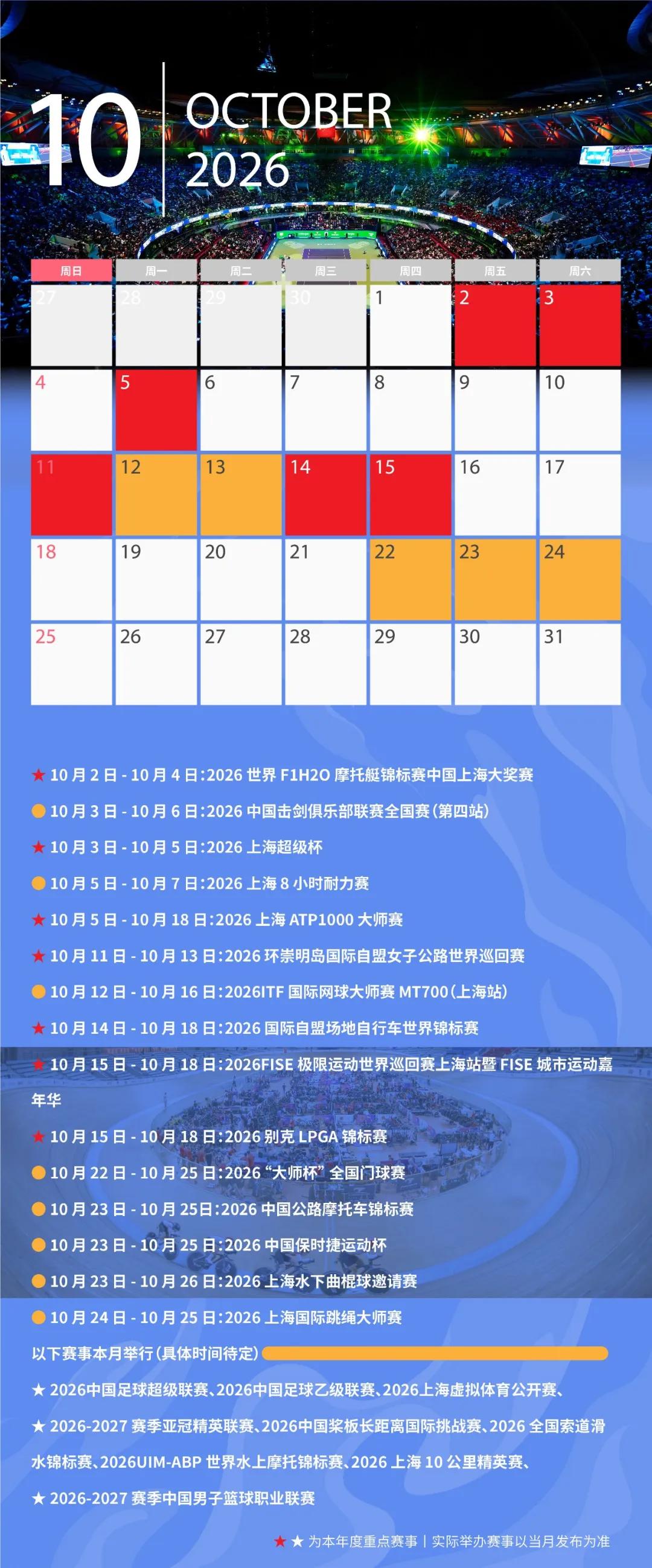 市体育局介绍,站在2025-2026交汇的时刻,上海已整装待发——全年计划举行165场(项)国际国内赛事,请收好这份上海2026年体育赛事年历↓