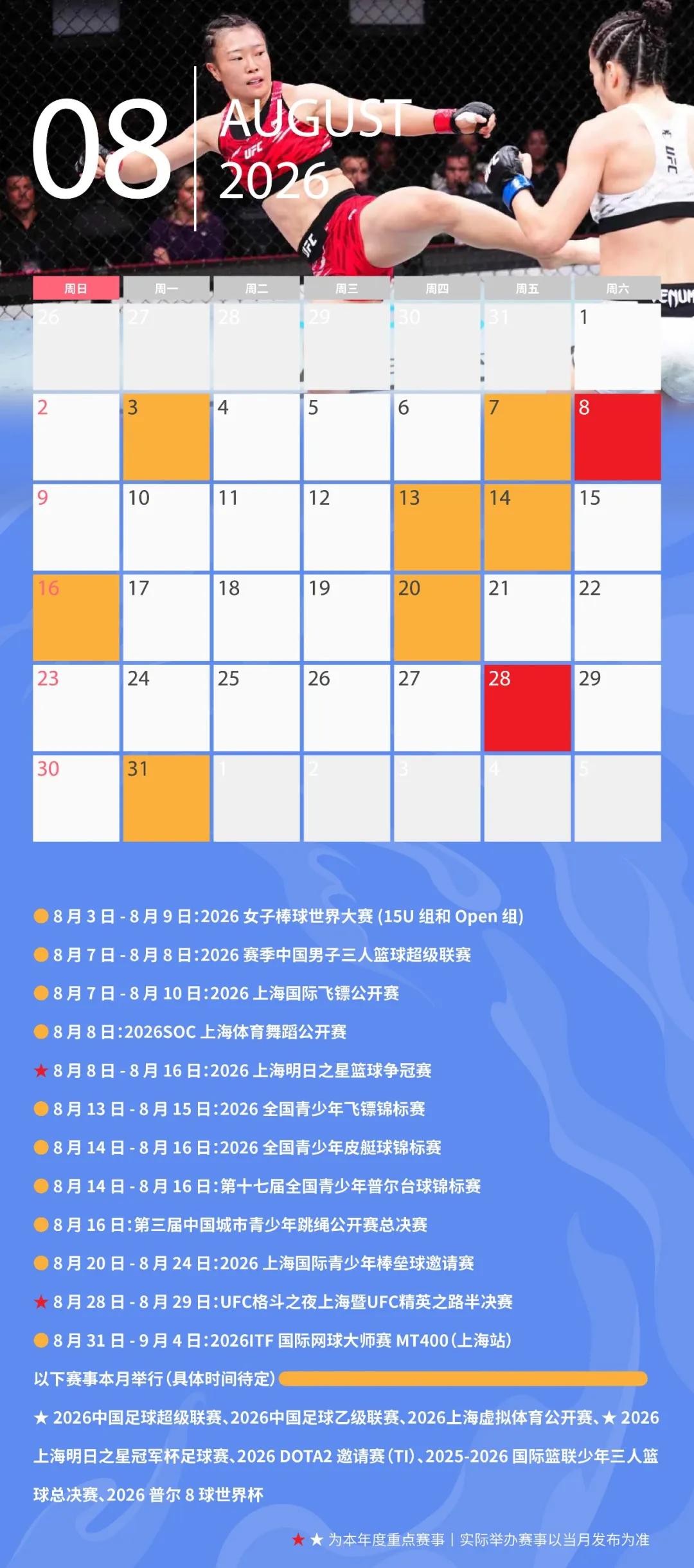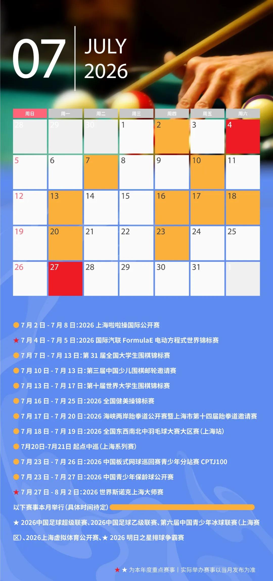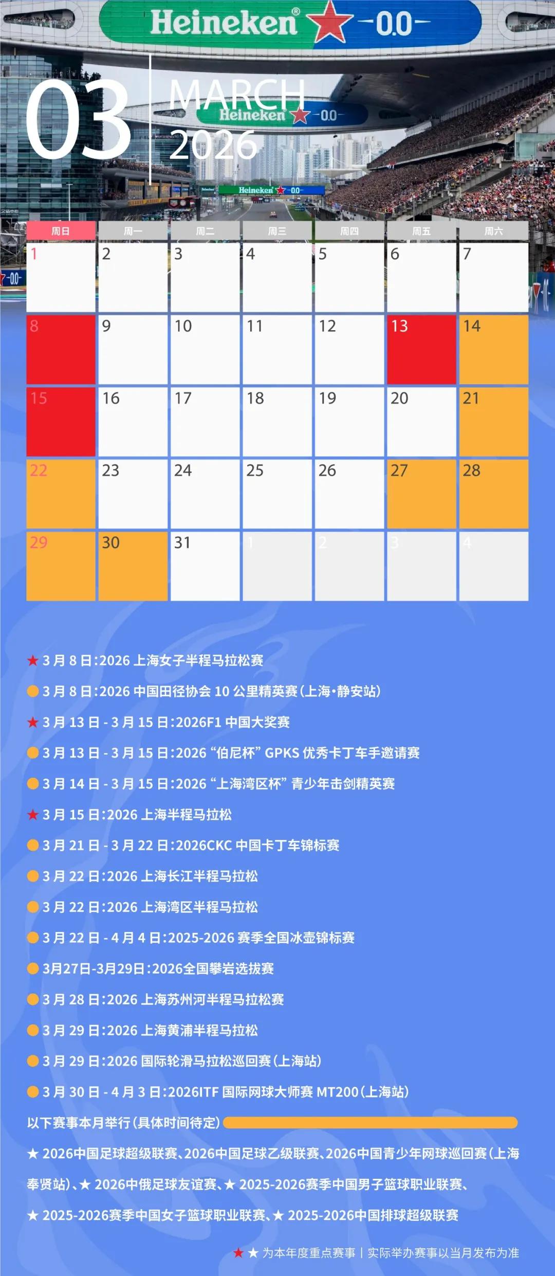 市体育局介绍,站在2025-2026交汇的时刻,上海已整装待发——全年计划举行165场(项)国际国内赛事,请收好这份上海2026年体育赛事年历↓