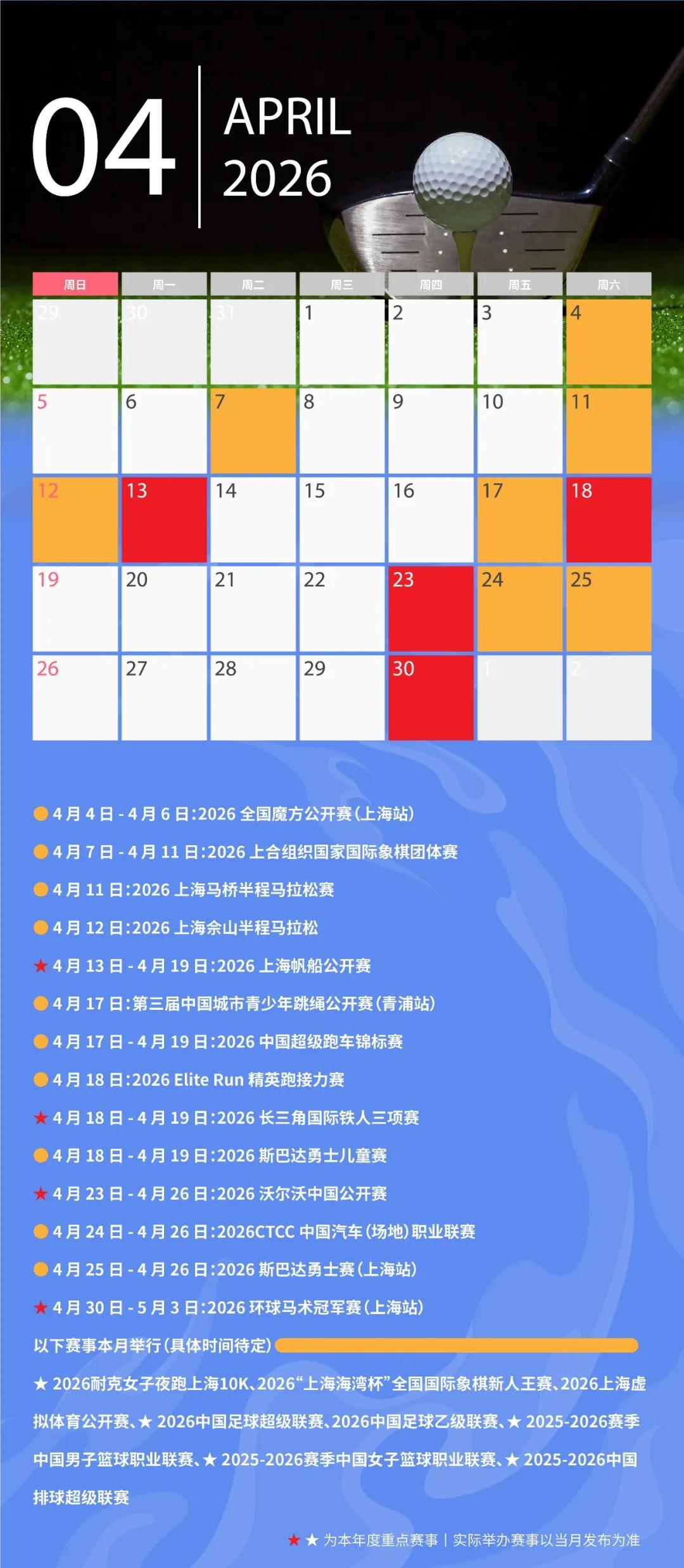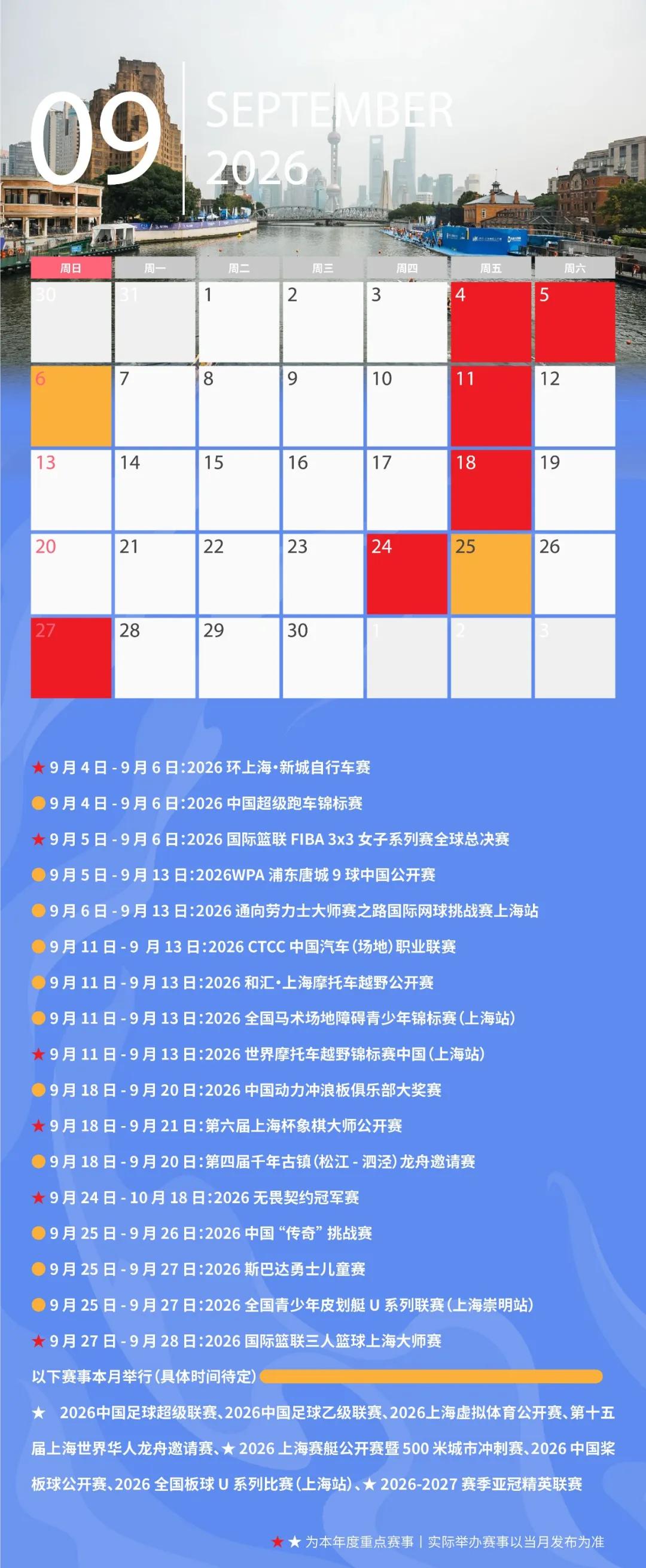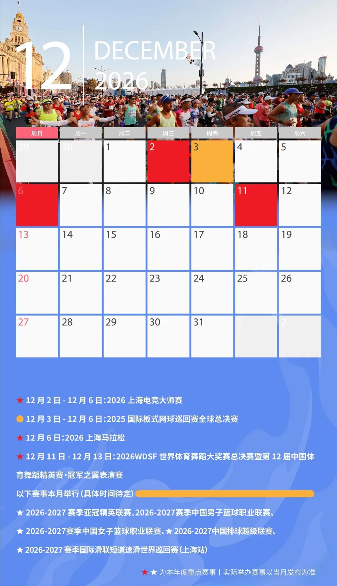 请收好这份上海2026年体育赛事年历,“因为一场赛 爱上一座城”,让我们一起观赛,共同喝彩!