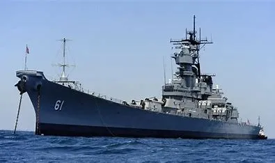 美国海军爱荷华号驱逐舰停泊在圣地亚哥附近,准备接受保存。