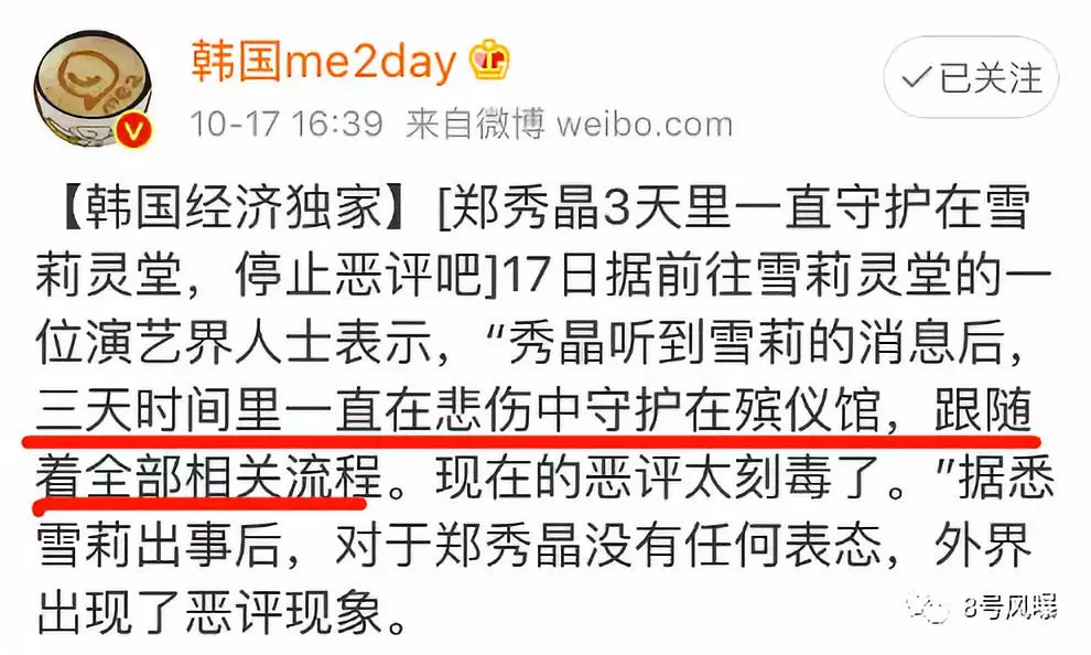 被骂的郑秀晶,则默默给雪莉守灵了三天,亲手跟进全部的流程。