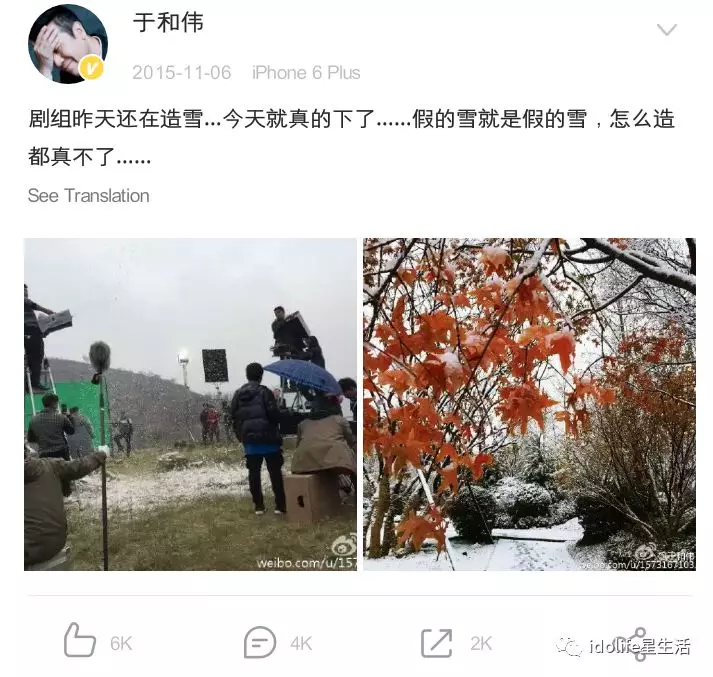 这次于和伟的态度依旧暧昧,他借在剧组拍雪戏,发了这样一条微博,话里有话,疑似回应 ↓