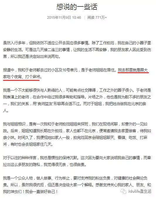 王丽坤这边呢,则是发了一篇长文回应,坚持他们只是“良师益友”,自己只是到于和伟家吃夜宵、打麻将……
