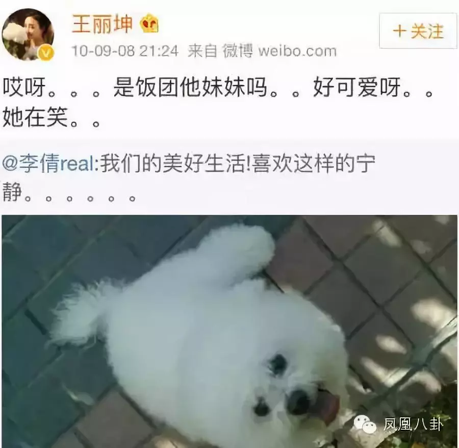唯一证据,是一条叫做“饭团”的狗。“饭团”是王丽坤养的一只公狗,曾频繁的出现在两人的微博里。