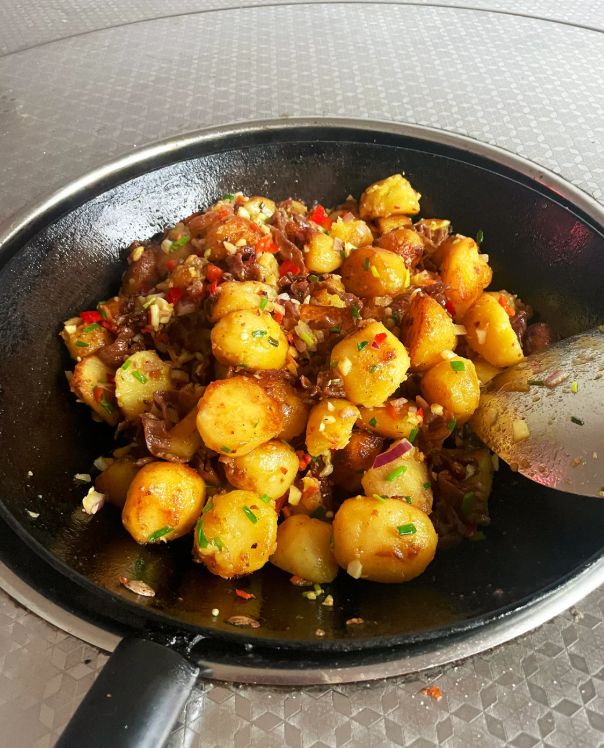 炕土豆的滋味,胜在“本真”二字。它的美妙在于对比:焦脆起壳的外皮与沙瓤般的内里,形成了绝妙的口感层次。那层“锅巴”是精华所在,浓缩了土豆的甜与油脂的香,咸鲜入味。
