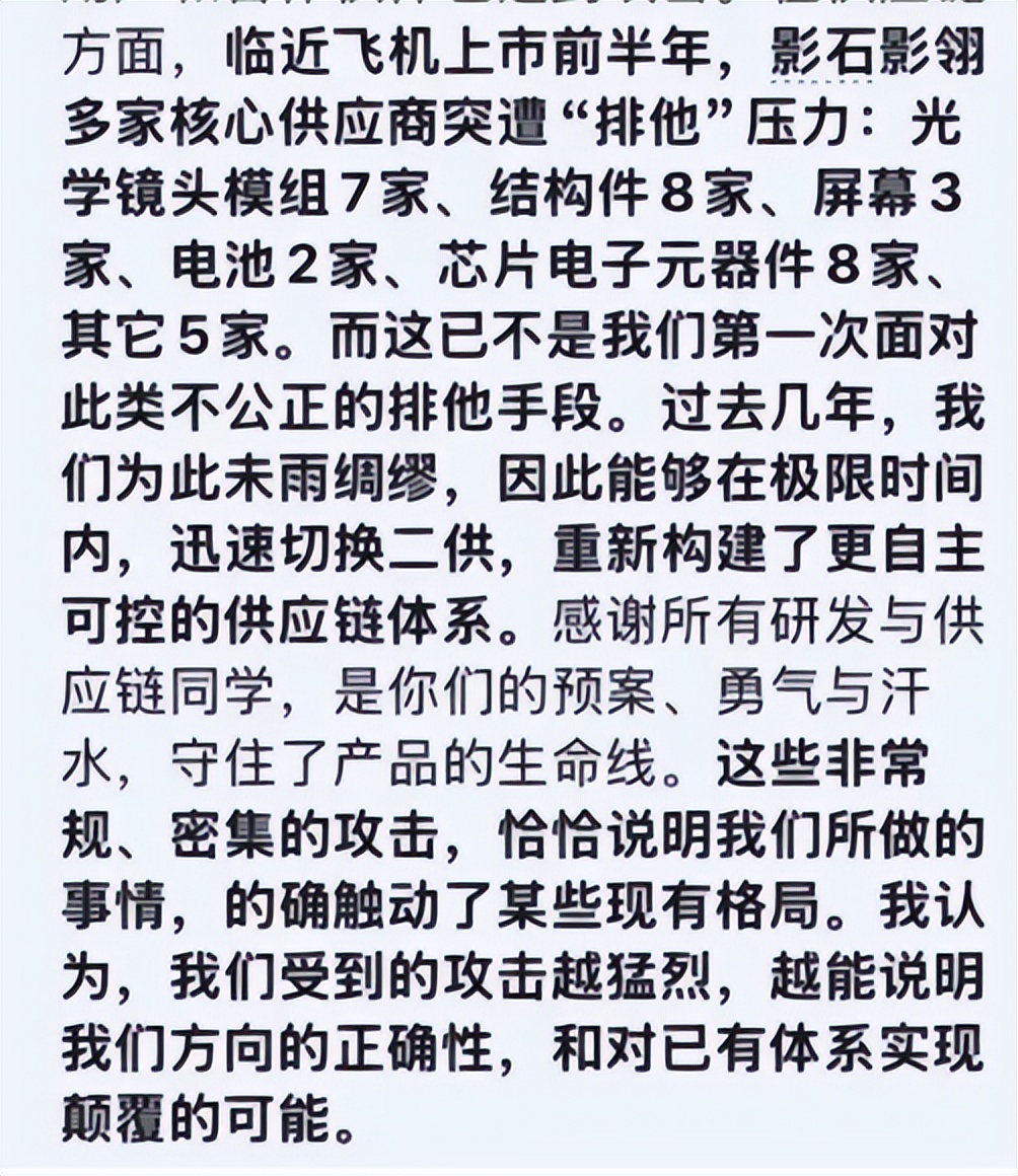 刘靖康在信中将近期遭遇的密集负面舆论与供应链压力视为“触动了某些现有格局”的表现,并强调“我们受到的攻击越猛烈,越能说明我们方向的正确性和对已有体系实现颠覆的可能。”