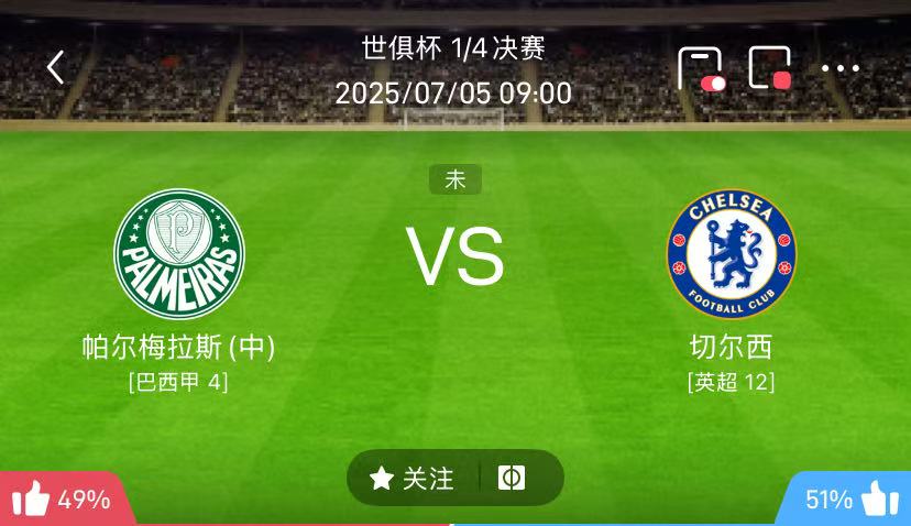 两队均经历加时赛(帕尔梅拉斯1-0博塔弗戈、切尔西4-1本菲卡),体能接近极限。切尔西历史交锋占优(2022世俱杯加时胜),但小组赛负于弗拉门戈的阴影可能影响信心