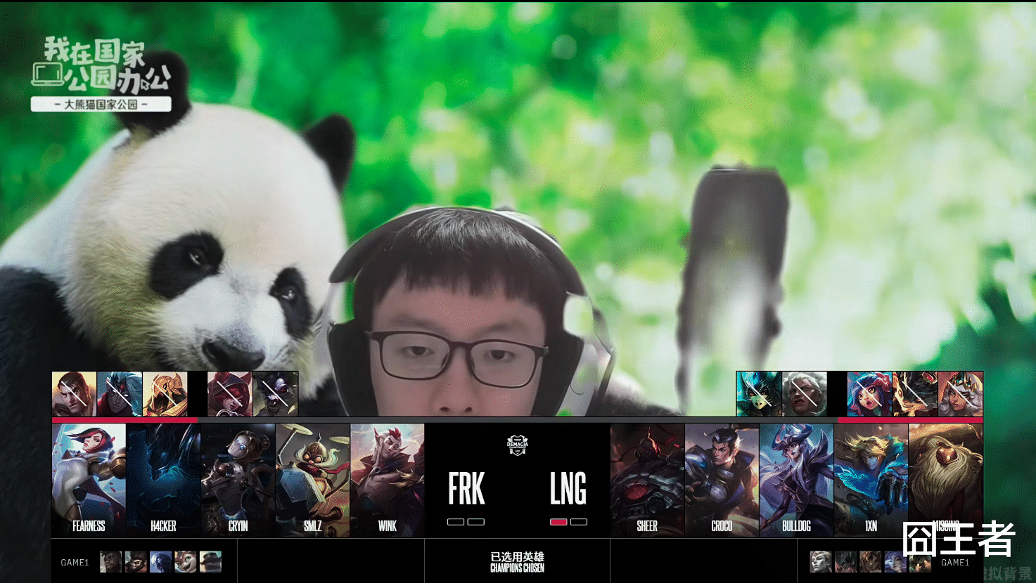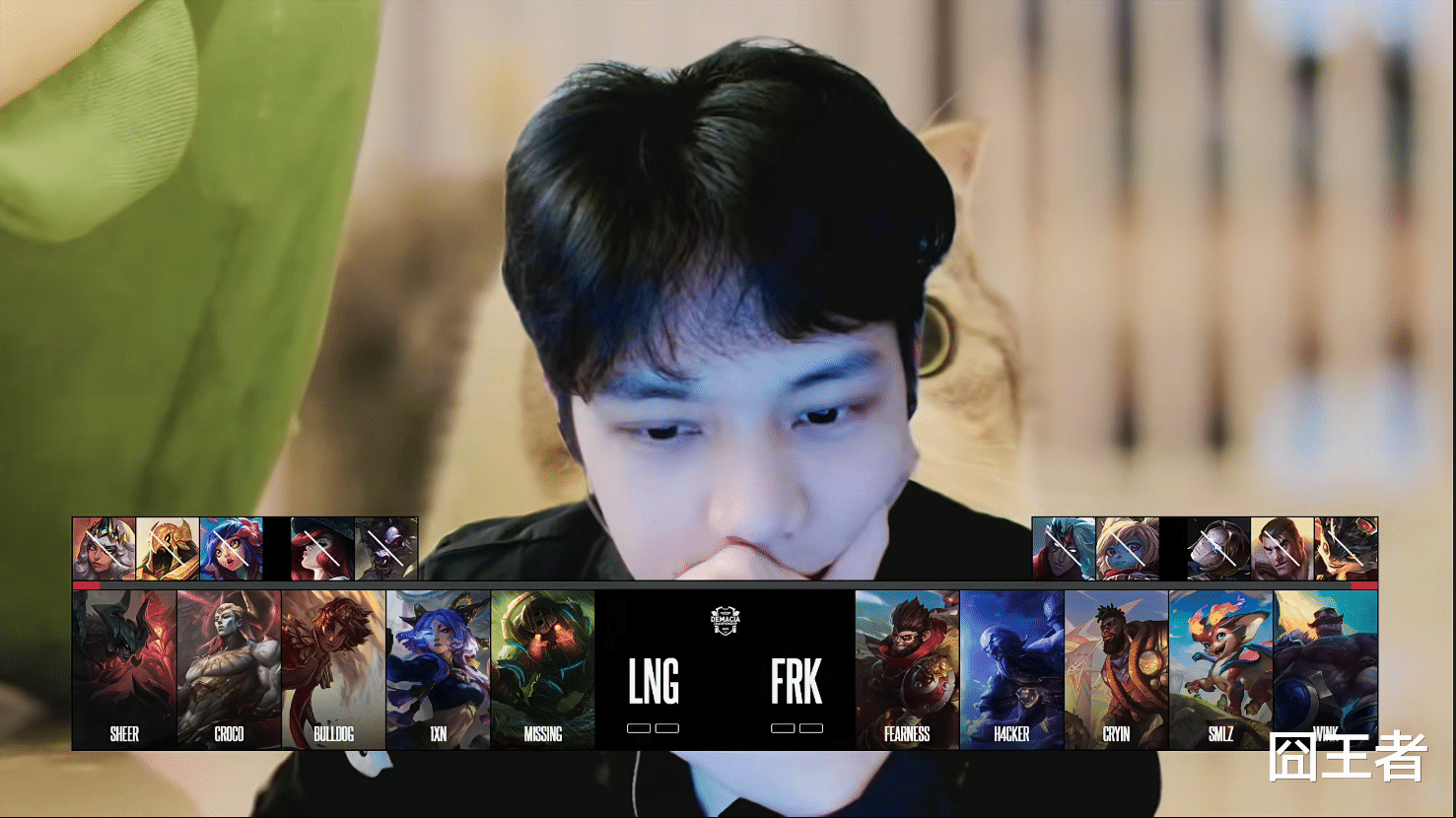 第一局比赛,LNG蓝色方,禁用:奇亚娜、沙皇、妮蔻 、女枪、阿利斯塔,选用:sheer亚恒、Croco剑魔、Bulldog岩雀、1xn芸阿娜、Missing泰坦;FRK红色方,禁用: 兰博、杰斯、发条、波比、韦鲁斯,选用:fearness奎桑提、H4cker猴子、Cryin瑞兹、Smlz小火龙、Wink布隆