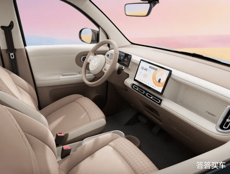 内饰方面,第五代宏光MINI EV内饰采用“焦糖奶油”主题色,棕色格子座椅颇具复古气息,换挡方式升级为怀挡,中控屏尺寸达到10.1英寸,细节处以“星钻流光”饰条点缀,前排座椅靠背可向后放倒至164°,车内的储物空间达20处,后备厢容积达838L。