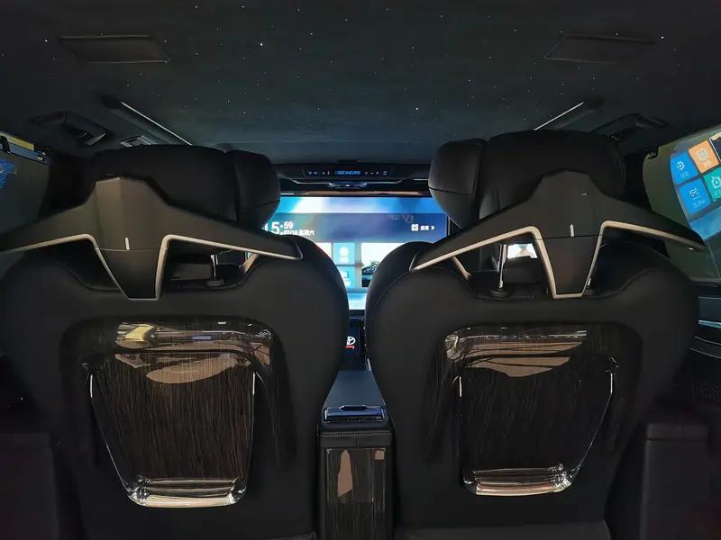 坐进车里,双15.6英寸一体式联屏、21.4英寸后排吸顶屏,加上12.8米环舱氛围灯,科技感直接拉满;隐藏式的Smart Surface魔术屏很有意思——不点亮时是块黑饰板,点亮后能控制空调、冰箱、氛围灯甚至后排娱乐系统,完全不破坏内饰整体性。