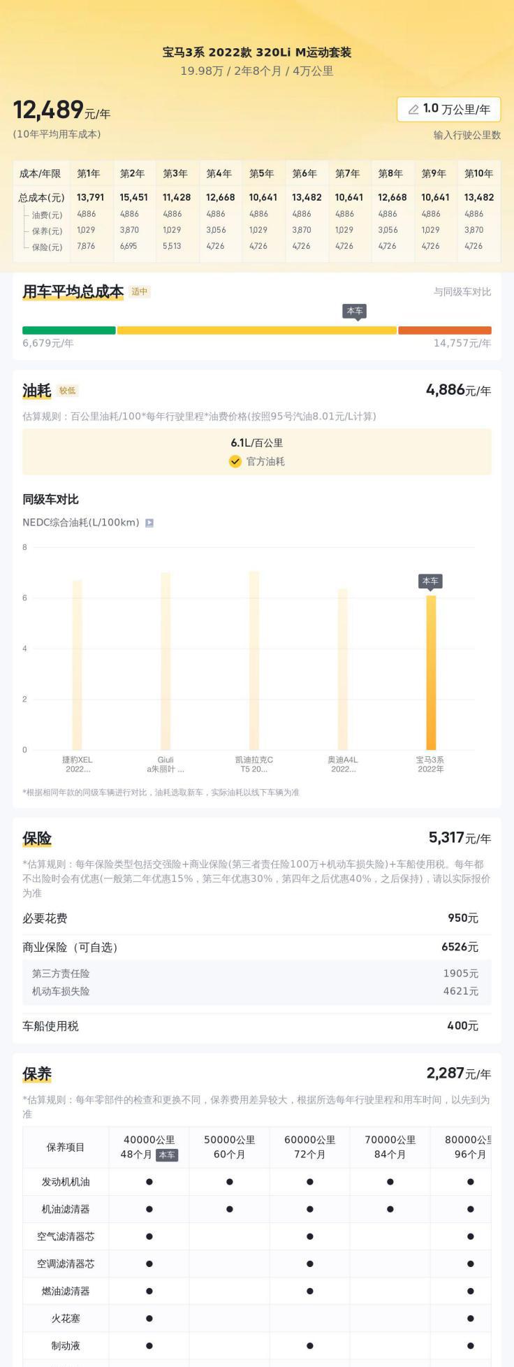 为了方便大家做决策,我们来做个简易的成本收益分析。假设这辆车使用五年,每年行驶1万公里。根据经验,燃油、保险、保养等综合用车成本,每年约为1.5万元左右。五年的总用车成本约为7.5万元。加上购车价19.98万元,总成本约为27.48万元。五年后,这辆车的残值大概在5万元左右。也就是说,你实际花了22.48万元,享受了五年宝马3系的驾驶体验。