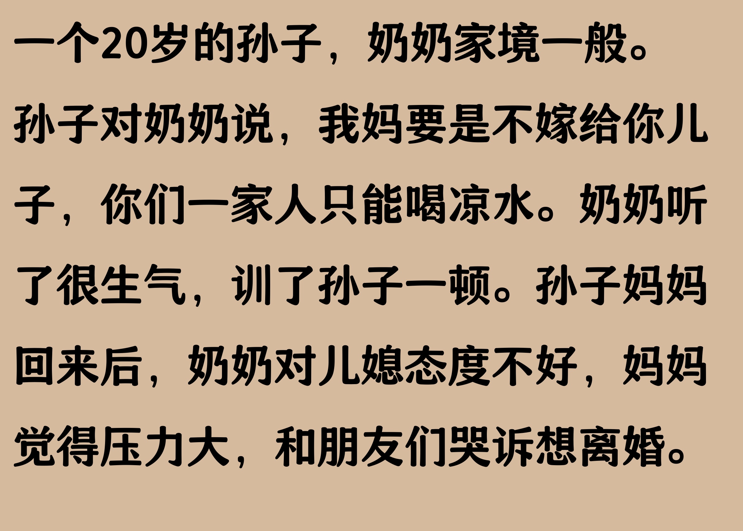 我20岁的孙子有一天突然对我说,我妈不嫁给你儿子,你们一家人只有喝凉水。我当时就愣住了,问他这是什么意思。他说他妈妈不愿意嫁给我的儿子,觉得我们家条件太差了,以后日子会很苦。我问他,你妈妈是怎么说的?他说他妈妈确实说过这样的话,还说不愿意跟我们这种家庭过日子。我问他,那你怎么办?他说他也不知道,他妈妈的意思就是不嫁了。我问他,你妈妈是不是真的这么想的?他说是的,他妈妈已经跟他说过很多次了。我问他,那你爸爸呢?他说他爸爸也劝过他妈妈,但没有用。我问他,那你怎么办?他说他也不知道,他妈妈的意思就是不嫁了。我问他,那你怎么办?他说他也不知道,他妈妈的意思就是不嫁了。我问他,那你怎么办?他说他也不知道,他妈妈的意思就是不嫁了。