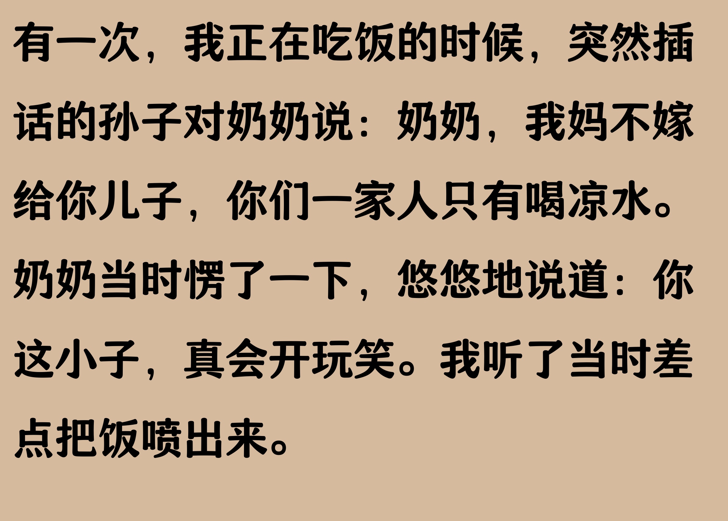 我孙子今年20岁,跟我奶奶关系特别好。今天他跟奶奶说:"奶奶,我妈不嫁给你儿子,你们一家人只有喝凉水。"奶奶问他:"你这是什么意思?"他跟奶奶说:"我跟你说实话吧,我这人就是个暴脾气,谁要是不顺着我,我就拿手指头戳的你疼得直叫。"奶奶问他:"你这孩子怎么这么横?"他跟奶奶说:"我跟你说吧,我这人就是个野路子,谁要是不听话,我就拿脚后跟和下巴戳的你疼得直叫。"奶奶问他:"你这是威胁我吗?"他跟奶奶说:"我跟你说实话吧,我这人就是个愣头青,谁要是不顺着我,我就拿两根手指头掐的你疼得直叫。"