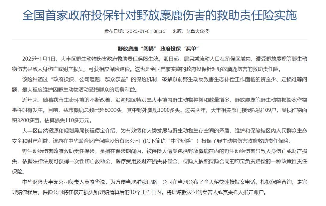 据悉,2025年,盐城市政府曾发布“全国首家政府投保针对野放麋鹿伤害的救助责任险实施”一文,政府投保为野放麋鹿“闯祸”进行“买单”。