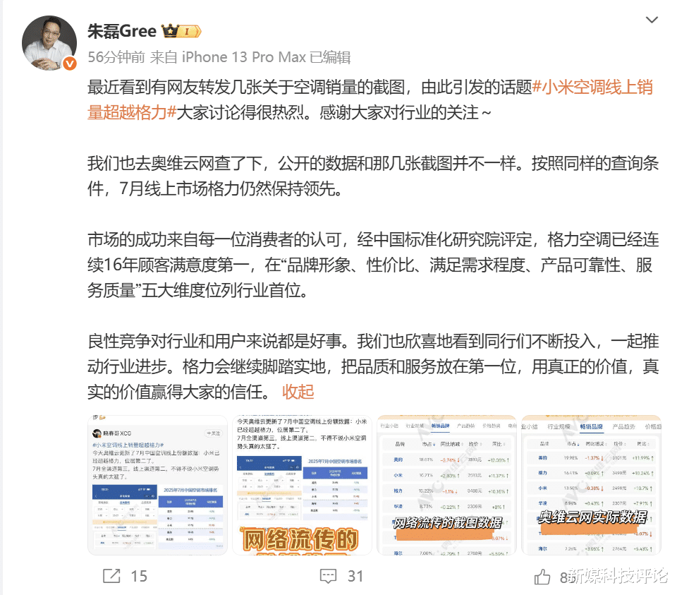 前段时间,#小米7月空调线上销量超格力#的话题登上了热搜,格力电器市场总监朱磊在线上提出了质疑。最终,网友发现是因为奥维云网的统计口径差异导致,但从中也可以看出家电行业竞争之激烈。